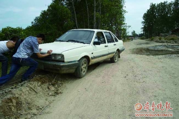 在迟下线北大村路段,记者看到了一幕:一辆由南向北行驶的普桑轿车车轮被路边足有几十厘米高的车辙挡住,车头悬了起来。在记者的帮助下,汽车最终倒了出来,但是车坏了,车轮始终往一个方向偏。