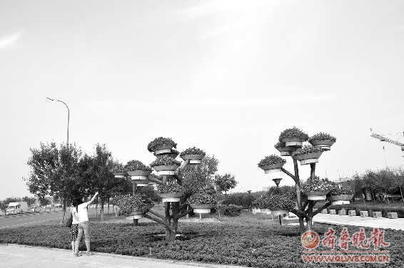 9月8日,市民在新区香山路与黄河路交会路路口欣赏树枝花篮。据悉,此次改造包括黄河路与庐山路、香山路、天目山路等六个路口的绿化改造提升。设置了别致的花树结合的立体造型,呈现出“车从绿旁过,人在花边行”的怡人景象。
