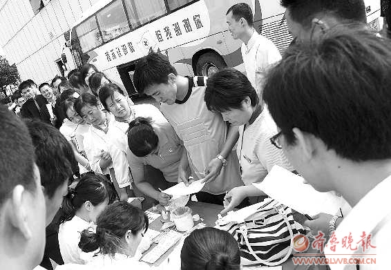 ▲献血车刚刚驶进蓝海新悦饭店,一会儿功夫等待献血的职工们就排起了长队。 本报记者 郑美芹 摄