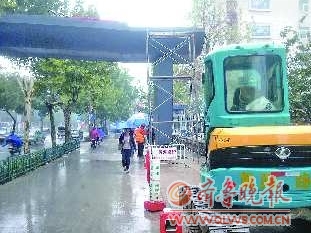 14日,记者在解放路中心医院附近看到,此处正在建设的过街天桥主体已经吊装完成,从桥面到地面的落脚还没有安装。由于下雨无法施工,一辆挖掘机停止工作停在路边。