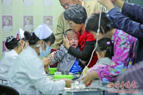 9月14日,济南中心医院儿科,患儿正在家长的陪伴下打点滴。近日济南连续阴雨天气使气温骤降,不少孩子患上了感冒,前来医院就诊的家长和孩子挤满了儿科门诊。本报记者 王媛 摄