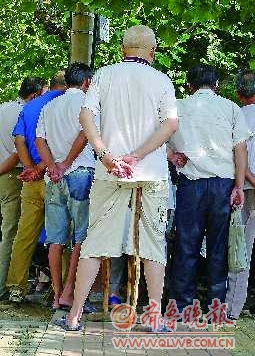 自述:围观看演出,拐杖充当临时座椅。