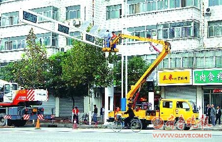 14日下午5时许,天衢西路与吕家街路口,工作人员正在安装红绿灯线路。据了解,15日,在文化路、德兴路、向阳路和解放路交叉口等58处新安装的红绿灯将正式启用。