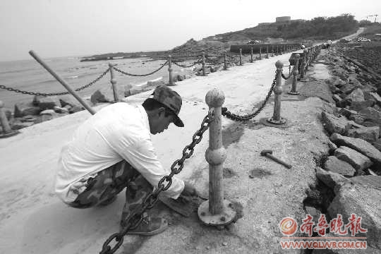 14日,记者在通往小麦岛的唯一道路上见到,工人正在安装护栏,然后重新粉刷防腐漆。据了解,因为今年台风损毁的道路已经整修完工,现在又新安装上护栏,保护过往行人的安全。本报记者 杨宁 摄影报道