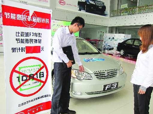 14日,记者走访了临沂多家汽车4S店了解到,大多数厂家已经收到厂家关于汽车节能补贴调整的通知。在沂河路东段一家比亚迪4S店里,甚至挂出了节能补贴的倒计时牌。销售人员告诉记者,他们是在9月初的时候收到厂家通知的,节能补贴将于10月1日调整。所以他们根据通知,制作了这个倒计时牌,目的就是想提醒消费者赶在政策调整前购买车辆。