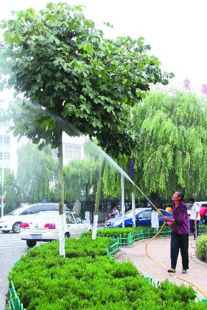 本报9月14日讯 (记者 孟凯 娄雅哲)市区羲之路段两侧青桐树滴“黑油”和飘“白絮”的原因找到了,“罪魁祸首”就是青桐木虱。14日,兰山区园林局出动喷洒车,对树木集中喷洒农药。