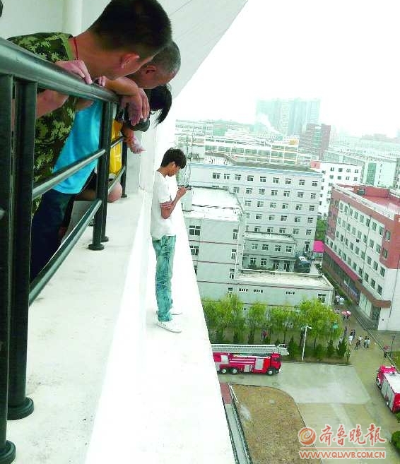 14日中午,天空飘着雨,在烟台开发区一家职业学校9楼顶楼,一名男孩以死相逼,要见这所学校的一名女学生。由于男孩提供的女孩的手机号码和QQ号码都不正确,救援人员想尽办法劝他放弃跳楼的念头。僵持了两个多小时后,男孩终于被成功解救。 图片由警方提供