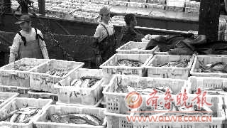 渔船靠岸后,分完等级的鲅鱼等待运输。 本报记者 李娜 摄