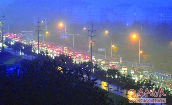 连续降雨使市区道路湿滑,车速降低,加上车流量大,导致市区部分道路通行不畅。南大街、二马路、环山路早高峰由东向西,晚高峰自西向东方向车流量大,加之烟台一中南校、烟台二中、烟台十中等中学放学时间与晚高峰时间重合,导致环山路晚高峰拥堵时间延长大道;通世路立交桥两侧匝道同时施工,导致通世路