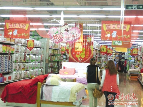 9月、10月是结婚的高峰期。14日,记者在泰城某超市内看到,超市专门设立了婚庆用品销售专区,方便准新人选购。
