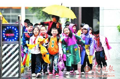 14日下午放学时间,市区一小学的老师雨中护送孩子们回家。