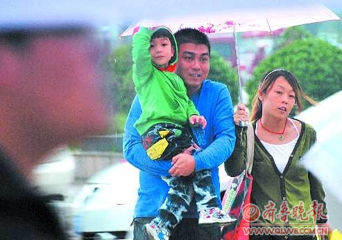 ● 在运河城路口,一位男士抱着孩子赶路,打伞的女士怕淋着