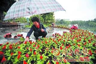 园林部门的工作人员冒雨照料花卉,把公园装扮的焕然一新。 本报记者 张晓科 摄