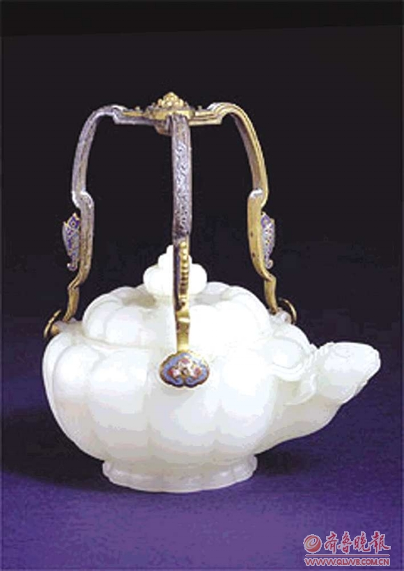 壶白玉质,玉白如脂。壶体为圆形,通体及盖、纽均雕作瓜棱状,腹部一侧凸雕羊首为流,肩部设3个系纽,上接3柄如意形铜胎掐丝珐琅质地的提梁。壶底中部阴刻隶书“嘉庆御用”四字款。