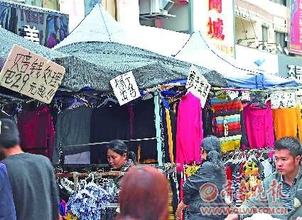 9月14日,德州步行街上搭的临时棚子里大幅减价出售已经过季的夏装,甚至连棚子也要_并售出。
