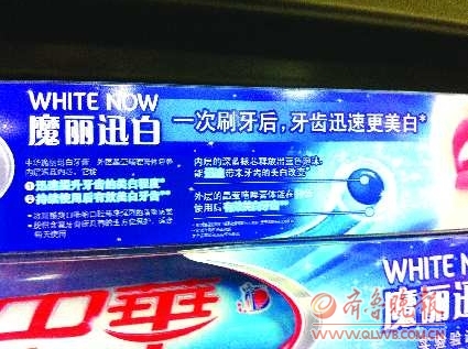 15日上午,在某超市内的牙膏货架上,记者找到了齐女士所说的中华魔丽迅白牙膏。包装上的广告宣称,“一次刷牙后,牙齿迅速更美白”。美白效果果真如此神奇吗?经过仔细查看产品外包装,在包装边缘的一个不起眼的角落里,记者看到“暂时性视觉效果,使用效果可能因人而异,受牙齿基色和光线影响”的说明。