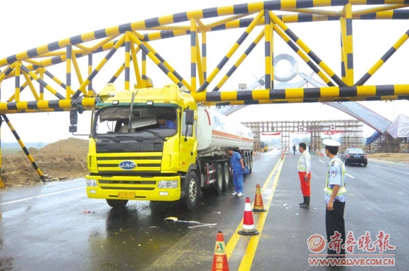 15日上午10点左右,在104国道汶河大桥南侧一限高处,一辆安徽籍乙醇罐装车被卡住,驾驶室上部被撞坏,所幸没有造成人员伤亡。执勤交警赶到现场并引导驾驶员驾车缓缓退回,换行其他线路。