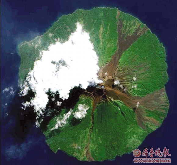 在距离巴布亚新几内亚大陆海岸大约8英里(约合12.9公里)的马纳姆岛上,马纳姆火山喷发形成了一片稀薄、模糊的火山灰羽状物,大片的云层聚集于火山顶部上空。本图由美国宇航局“地球观测1号”卫星上先进的陆地成像仪所拍摄。