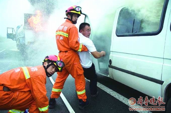 15日上午9点05分,日照市公路局、日照市公安交警支队、日照市消防支队和日照市卫生局联合举行了高速公路应急演练。按照演练方案,沈海高速日照北段,一辆小型客车与一辆满载乙醇的槽罐车发生追尾,导致大量乙醇泄漏,发生燃爆。据介绍,除伤员是假装的,所有的一切都是真实现场。图为模拟事故现场,消防人员对伤者进行救援。 本报记者 刘涛 彭彦伟 摄影报道