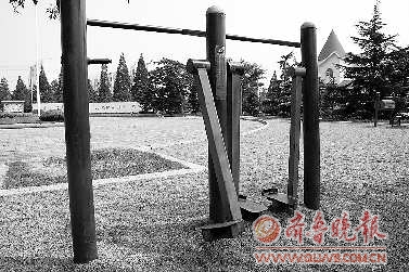15日,记者来到位于天津路与郑州路交会的日照市开发区公园。在健身区,记者看到,大部分健身器材或螺丝没了或锈迹斑斑。一个自重蹬力器上的三个座椅全都不翼而飞;一个太空漫步机则缺了条“腿”。