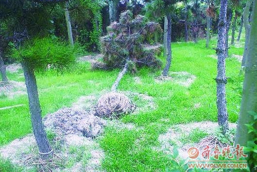 “这些松树都是移植过来的。”附近的居民苏老先生说。他平常没事的时候就喜欢散步,也经常会路过绿化带这边。据他介绍,这几棵黑松已经“卧倒”一个多月了,或许是移植过来后没有栽结实,被风吹倒了。那一小片干枯的黑松,移植过来没几天就枯死了。