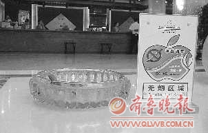 15日,在市区一家四星级酒店大堂,“禁烟牌”和烟灰缸成鲜明对比。