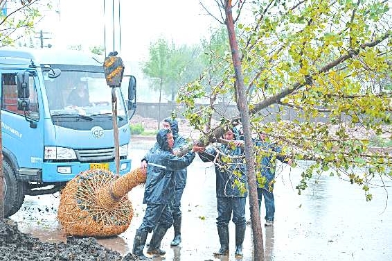 9月15日上午,绿化工人正在西一路绿化工地上冒雨栽种银杏树苗。创建国家园林城市检查验收在即,为增加绿化景观,东营区城管局抓住雨天土壤墒情较好,适宜苗木补栽的有利时机,冒雨栽植苗木,确保苗木成活率。据了解,西一路绿化工程总投资1600万元,绿化面积94000平方米,主要种植白蜡、国槐、银杏、龙柏、紫叶李、萱草、地被菊、景天等30多种植物,该工程将于9月下旬完工。 本报通讯员 商瑞娟 本报记者 李金金 摄影报道