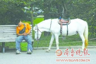 瞌睡,身旁的马儿也和主人同时打瞌睡。