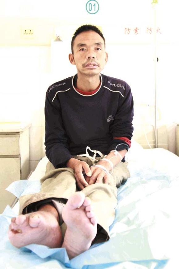 15日,记者在国际和平医院见到这位男子,他比较瘦,右脚肿得厉害,多处有伤口。护理员高腾介绍,伤口感染发炎一直高烧不退,保守治疗也需要截肢,但他不配合治疗。“前几天他偷偷溜出去,在外面睡了两夜,我们把他找回来的。”