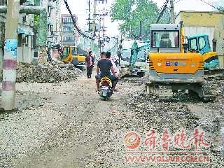 在施工现场的工棚里,一位不愿透露姓名的工人告诉记者,目前他们整修的路段全长300米,路面从10米拓宽到20米,按照工期要求,从今年4月份动工开始,3个月内完工。但是,由于前期拆迁工作没有做到位,目前施工进展受到很大影响,“只能等着前面拆一点,我们赶紧跟着往前施工一点。”