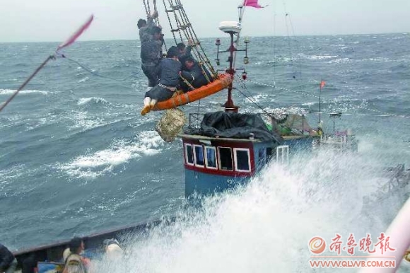 A03?重点 17日,救援人员用救生吊篮将被大浪困住的渔民吊起。当日10时左右,一艘辽宁籍渔船在烟台东北49海里处捕鱼作业时遭遇9级大风,船舱进水,即将沉没,11名船员命悬一线。交通运输部北海救助局收到救助指令后,经过近半小时的生死营救,将遇险船员全部救起。 本报记者 张琪 通讯员 张宁 原明伟 摄影报道