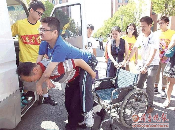 9月8日上午正好是2011级新生选选修课的日子。唐献忠做送奶工的时候习惯了早起,4点多就睡不着了,起来洗衣服、打扫宿舍、买早饭。6点半左右,唐献忠喊儿子起床,帮他洗漱、穿戴好。9点15分,“旭日东升”志愿者服务队的同学推着轮椅来送唐旭去教室选课。