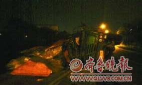 “在八号码头西门北1000米处的杭州支路上,一辆货车侧翻在了路边,包括司机在内的两个伤员正送往骨伤医院。”18日下午5点35分左右市民打来热线电话。记者赶到事发现场,看到位于杭州支路青岛港八号码头西门北1000米处,路右侧一辆斯太尔大型货车侧翻,车头朝北,车厢右侧整个贴靠在地面上,车头靠近地面的右上角部位被完全压瘪,副驾驶座位置已经完全变形,车内的座位上沾满了血迹,两侧的车窗玻璃和车前的挡风玻璃都被压碎,地上布满了细碎的玻璃渣,车上的货物也散落了一地,现场正有4名工人将散落在地上的货物搬运到另一辆货车上,准备将货物运走。在车身和货物下,一段大约10米长的路边护栏被压倒在地。