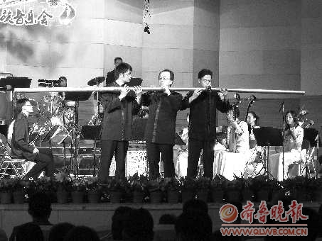 本报9月18日讯(记者 董传同) 17日晚,“宝岛-长河两岸情”大型民族音乐会在德州学院南校区音乐厅上演。台北琴园国乐团三人吹奏的四米长笛引起观众阵阵惊呼。现场的乐团主持人介绍,这应该是目前用来演奏的最长的笛子。