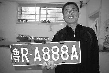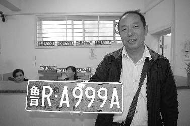 终选择了鲁RA999A的号牌,办完相关手续后、他顺利领取到了自己的号牌,并请记者拍照留念。