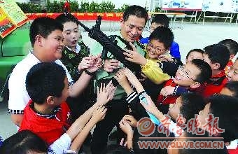 19日,槐荫区新世界阳光花园小学,槐荫区武装部将国防教育活动办到了校园内。孩子们参观展板、举行国防教育知识问答,还穿起迷彩服、拿起了最新的九五式步枪,体验当兵的感觉。这个星期是国防教育周,该区武装部将轮番进入各个校园,向学生们宣传国防的意义。