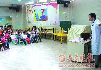 9月20日是第23个“全国爱牙日”,“爱牙日”前夕,济南卓雅·大风车幼儿园特邀千佛山医院的医生给宝宝们上了一堂牙齿保健课。牙医叔叔拿着牙齿模型当场示范,指导幼儿正确的刷牙方法。 (杨颖)
