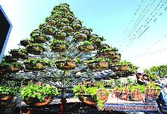 随着国庆节的临近,济南街头花团锦簇。9月19日,一个由160余个不锈钢盆花制作而成的松树造型亮相解放桥附近,吸引不少游人的目光。 本报记者 左庆 摄