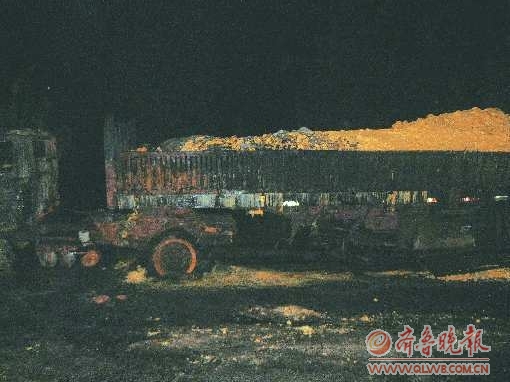 本报9月19日讯(记者 彭彦伟) 19日凌晨1点左右,在日照市335省道陈疃镇附近发生一起车祸。一辆拉铁砂的半挂车撞向停在路边的一辆载满硫磺的卡车,并引燃硫磺车,大火40余分钟后才被扑灭,所幸并未造成人员伤亡。记者闻讯在第一时间赶往现场。
