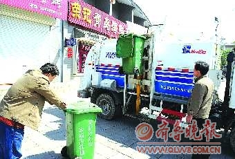 20日上午,在章丘市明水街道的荣记海鲜米线馆,记者看到这家店门口放置了两个密闭式餐饮垃圾收集桶。餐饮垃圾车来到后,将两桶垃圾自动倒入车中。小型洒药车紧随其后,对垃圾桶进行清洗、除臭、灭蝇,处理完毕后收集桶又被放回原位。