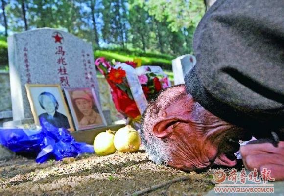 20日上午,山东籍抗美援朝烈士冯兆柱的儿子冯敬业等17位烈士亲属,来到辽宁省丹东市锦江山北麓的抗美援朝烈士陵园,祭奠长眠于此的亲人。60年来,冯敬业没见过为国捐躯的父亲;60年来,冯家一直在苦苦找寻。在“见到”父亲的那一刻,冯家“团圆”了,69岁的冯敬业在父亲碑前以面贴地,长跪不起。 本报记者 张中 摄