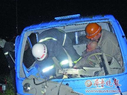 18日20时许,夏津县德商公路新盛店镇左王庄路段一辆面包车与一辆机动三轮车相撞,两车司机被困。夏津城北消防中队赶赴事故现场,救出两名被困司机。 本报记者 徐乐静 摄
