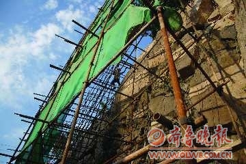 20日,在福州北路上,青岛地矿岩土工程有限公司的工人正在搭起的脚手架上。据介绍,为防止山体滑坡,该公司自本月初就开始对此处进行加固。截至目前,整个工程进展顺利,预计半月内就能完工。