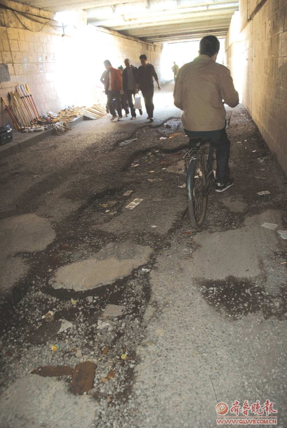 19日,记者在火车站铁路桥洞西侧道路看到,尽管是白天,桥洞中依旧十分阴暗,洞中道路破损严重,有的地方出现了五六厘米的深坑,常有市民因避让坑洞而发生碰撞刮擦。李先生说,有许多高中学生,每天要从这个桥洞下路过,危险可想而知。据周围商店老板介绍,此处路灯已经有3个多月不亮了。在夜间曾摔伤过多人,仅上周就有五六名骑自行车的市民摔伤。