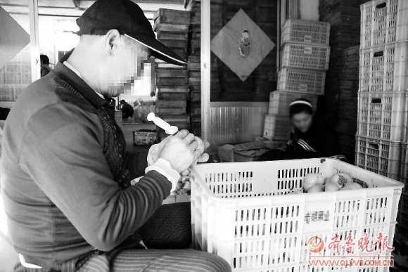 20日,记者来到刘先生所说的水果市场,在一家水果批发商铺内,两名店员正将地上的柿子进行装箱封存,还有一名店员正用一支注射剂将针管里的药液点到柿子的果把处。