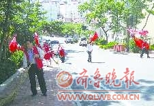 9月20日,环翠楼办事处城管办组织南山、塔中、杏花村、大众四社区党员、义工、楼长志愿者共100余人,对辖区绿地、野广告、乱堆乱放进行整治,并在社区一些街道树起红旗,迎接即将到来的国庆节。 本报记者 李彦慧 摄