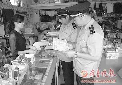 近日,文登市工商局对全市乳制品经营业户进行食品流通许可证变更。图为工商人员向超市经营者讲解相关法规,对超市乳制品进行现场检查。