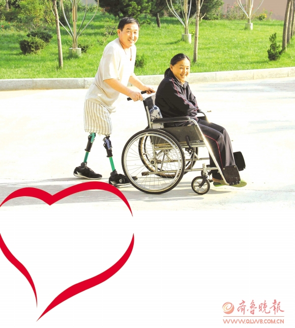 20日下午阳光灿烂,在泰安市社会福利院内,双腿安装假肢的市民汪先生,让妻子坐上轮椅体验一把被照顾的感觉。据悉,三年前,一场车祸夺去了汪先生的双腿,三个孩子都已成家立业,妻子一直不离不弃地照顾着他。今年是他们结婚30周年,近日他又安上了假肢,如今他最大的心愿就是用余生为妻子分担辛苦,回报妻子的恩情。