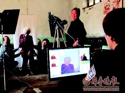 21日,岱岳区道朗派出所户籍科的民警带着电脑、补光灯、幕布来到朱家洼村,为99岁的赵连秀老人采集二代身份证照片。据民警介绍,现在60岁以上的老人每月有55元的社会津贴,必须用二代身份证领取,所以近期办理二代身份证的老人特别多。