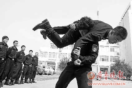 9月21日,德州市保安大队的武装押运队员正在进行对抗训练。这些安保队员平时进行银行运钞车武装押运,他们利用空闲时间,进行擒敌拳对抗练习,加强业务素质。
